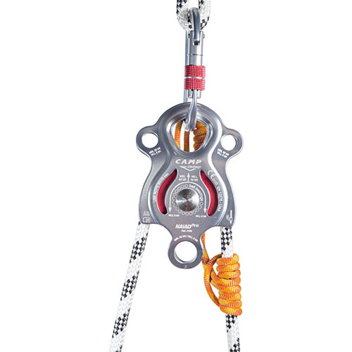A high strength multifunctional pulley for heavy hauling and complex operations. Features a large wheel, a main attachment point that accommodates three carabiners, a large bottom attachment point, and two secondary attachment points on the sides for linking, positioning and attaching progress capture systems. For use with ropes up to 16 mm. Prusik minding, the self-locking knot can be installed on both sides. Self-lubricated bushings are sufficient for light applications at low speed. Efficiency: 90%. Aluminum alloy body and wheel, stainless steel axle.