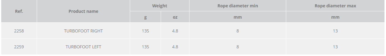 Hook these mini ascenders to your feet and climb lines with greater ease than you ever imagined! Proprietary rollers are positioned where the rope tends to rub on the body of a traditional ascender to ensure smoother action and a longer product life for both the ascender and the rope. The toothed cam is finished with a special anti-wear treatment and features drain holes to help prevent the build up of mud and grit. The innovative strap design provides a secure fit to any kind of boots or shoes and aligns the straps with the direction of the forces being applied for optimal comfort and efficiency. The proprietary rollers also allow the Turbofoot to be rigged as a locking pulley for light hauling with a max load of 50 kg, 110 lbs. (NOTE: This configuration is not intended for hauling or securing of bodies). For semi-static and dynamic ropes ranging from 8 to 13 mm. WARNING: the Turbofoot is for progression only and must not be used as a life safety attachment.