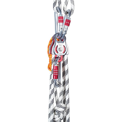 双滑轮适合组建滑轮组,超大承重连接孔可同时连接两把安全挂钩,两侧可安装抓结,轴承润滑设计适用于高速工作环境,工作效率:92%,最大过绳直径:13mm。铝合金材质侧板和转轮,不锈钢轮轴,拉力:26KN,工作负荷:1.8KN*4=7KN,尺寸:高102mm*宽61mm,上承重挂点孔径26mm/下承重挂点孔径14mm,重量:155g。认证标准:CE EN 12278+EAC