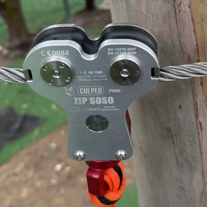 The CULPEO ZIP SOSO P980 Shuttle is designed for continuous backup systems. This means neither rehanging nor unhanging are necessary. Thus, it is suitable for ropes courses and zip lines and offers easy handling. The system complies with the requirements of the PPE Regulation 2016 /425.