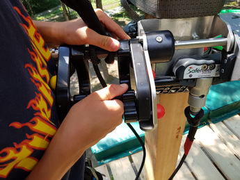 一种双不对称系索,由一根连接到传送装置的短绳和一根提供冗余的长绳组成。在跳跃或使用时,安装在用户头部够不到的地方。